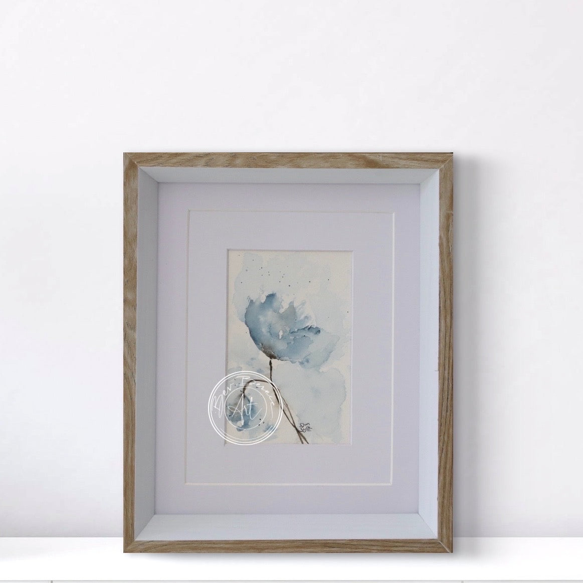This delicate watercolour painting features a soft, abstract flower in calming shades of blue, blending seamlessly into the background. The flower’s subtle, fluid strokes suggest an ethereal and dreamlike quality, with fine, dark lines forming its stem and hinting at its shape. The minimal use of colors and the light splashes of paint around the flower add a sense of movement and spontaneity, enhancing its abstract nature.