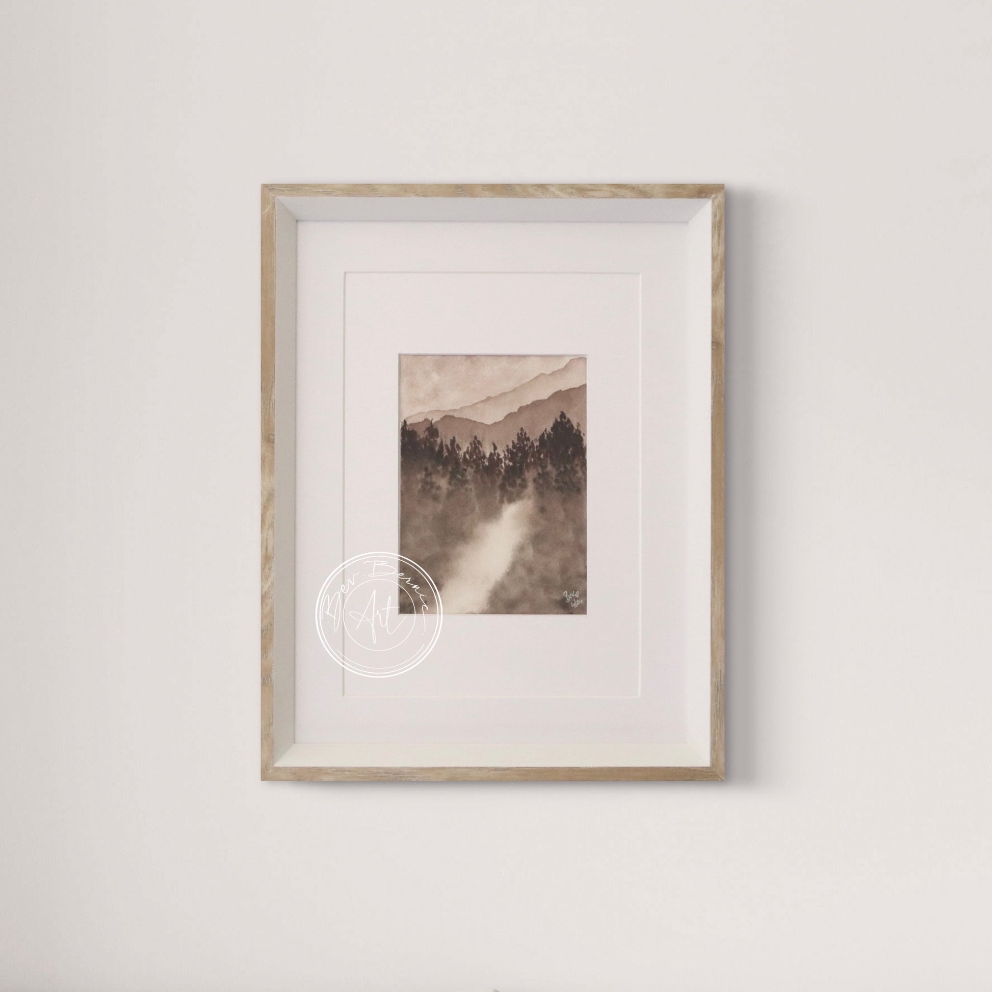This original watercolour painting captures the serene beauty of mist rolling through a forest of silhouetted trees beneath distant mountain ridges. Painted in calming, earthy hues of sepia, the piece evokes a sense of tranquility and timelessness. Ideal for nature lovers or anyone seeking a peaceful landscape to adorn their space.