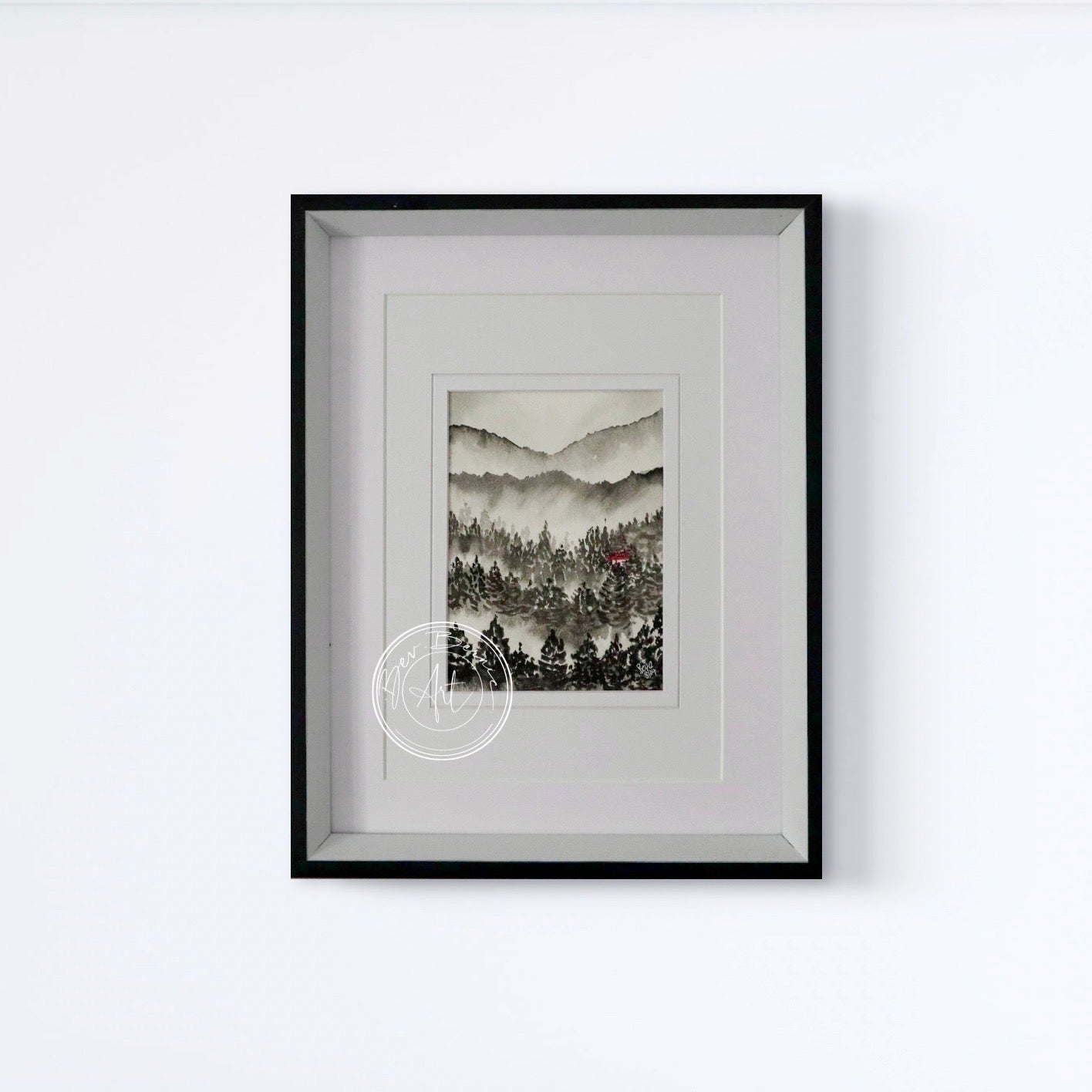 Immerse yourself in a serene mountainside view with this original watercolour painting. Layers of mist drift through the evergreen trees, capturing the essence of a quiet, foggy forest. A pop of red from a hidden cabin nestled among the trees adds a touch of warmth and mystery to the scene. Perfect for lovers of nature and minimalist decor, this piece brings the calming beauty of the outdoors into any space.
