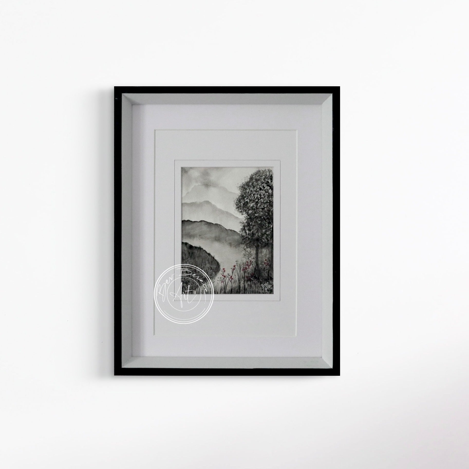 This original watercolour artwork captures a serene riverside scene, rendered in a monochromatic palette with delicate touches of red to enhance the natural beauty. The misty mountains in the background fade softly into the distance, creating a sense of calm and depth. A tree with finely detailed foliage stands beside the river, while wildflowers bloom along the riverbank, adding a subtle pop of color to the composition.