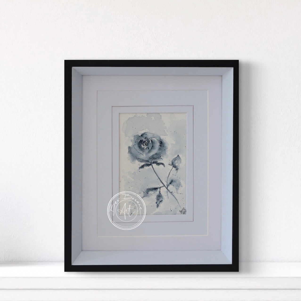 This unique watercolour artwork captures the delicate essence of a single rose rendered in a monochrome palette. The minimalist approach highlights the subtle details, giving this piece a timeless and elegant appeal. Perfect for lovers of understated beauty, this painting is ideal for adding a touch of sophistication to any space. Mounted in white, this piece stands out with its gentle contrasts and organic texture. Add a touch of simplicity and elegance to your decor with this hand-painted watercolour rose.