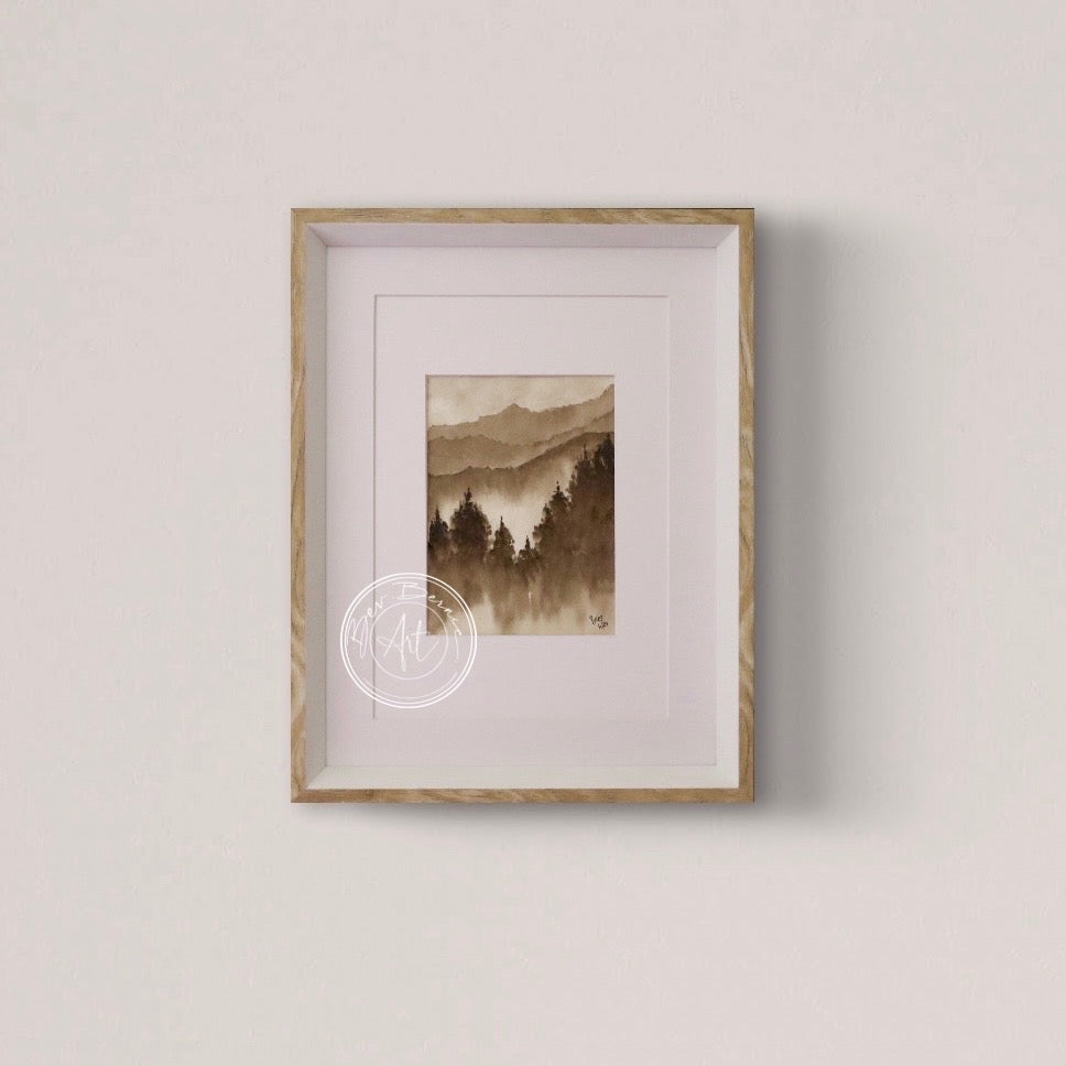 This original watercolour painting beautifully captures the serene majesty of misty mountains layered against the horizon. Created in a calming monochrome sepia palette, the piece showcases the delicate interplay between the soft mist and the dense treetops in the foreground. Perfect for lovers of minimalistic nature scenes, this artwork evokes a sense of tranquility and depth, transporting the viewer to a peaceful mountainside.