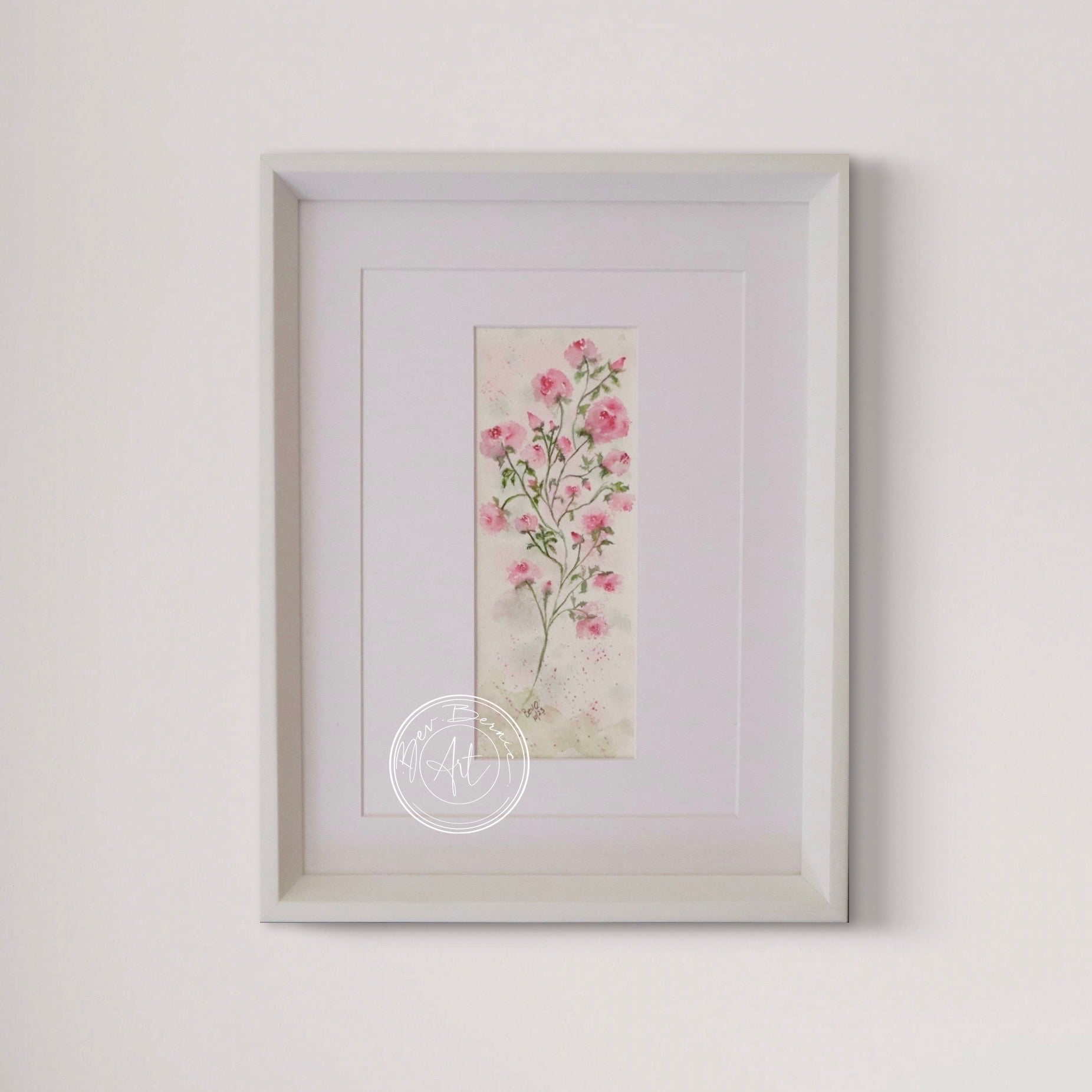 This delicate watercolour painting captures the graceful charm of soft pink rose blossoms on slender green stems. The hand-painted flowers seem to float on a dreamy backdrop of light splashes, giving the artwork an ethereal feel. Framed by a crisp white mat, the vertical composition makes it perfect for displaying in narrow spaces or as part of a gallery wall. Each petal and leaf is meticulously painted with a gentle, natural flow, bringing a sense of tranquility and fresh beauty to any room.