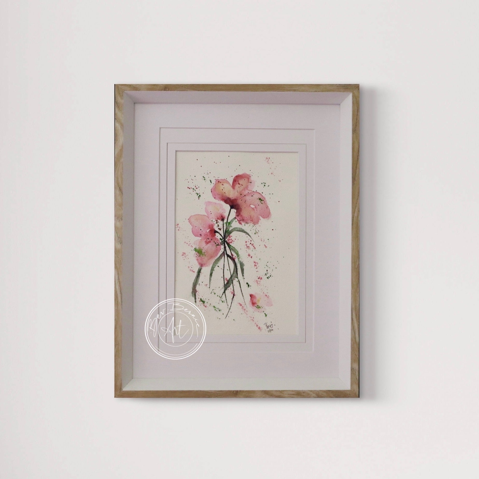 This delicate watercolour painting features a bouquet of soft pink flowers with gentle green accents, artfully arranged in a loose and expressive style. The splashes and drips add a playful energy to the composition, creating a feeling of natural beauty and spontaneity. Ideal for adding a touch of elegance and warmth to any space, this piece brings the freshness of a blooming garden indoors.