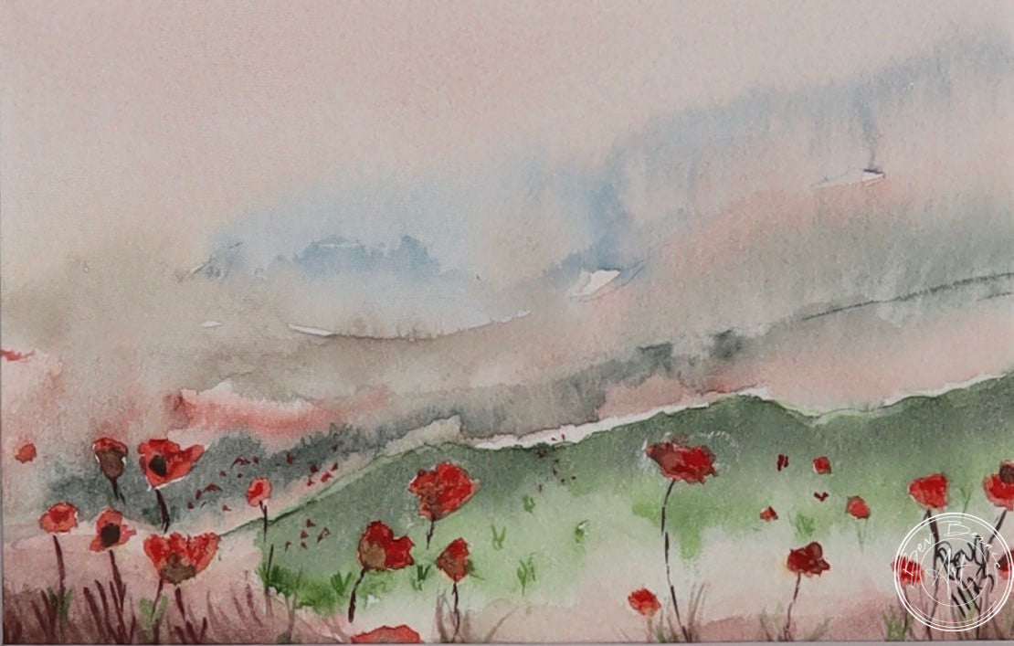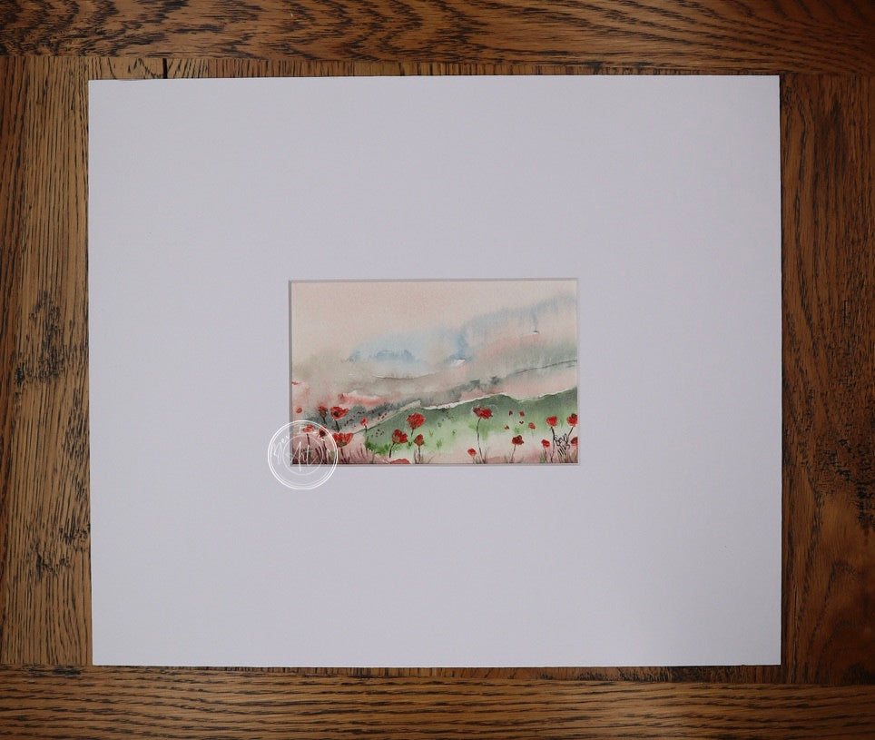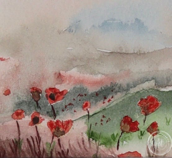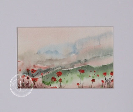 This delicate watercolour painting showcases a serene landscape of vibrant red poppies scattered across a lush green field, gently blending into soft, misty hills in the background. The atmospheric effect created by the fog and the pale sky adds a dreamlike quality to the piece, evoking feelings of peace and calm. Each poppy is meticulously painted with shades of red, capturing their fragility and beauty.