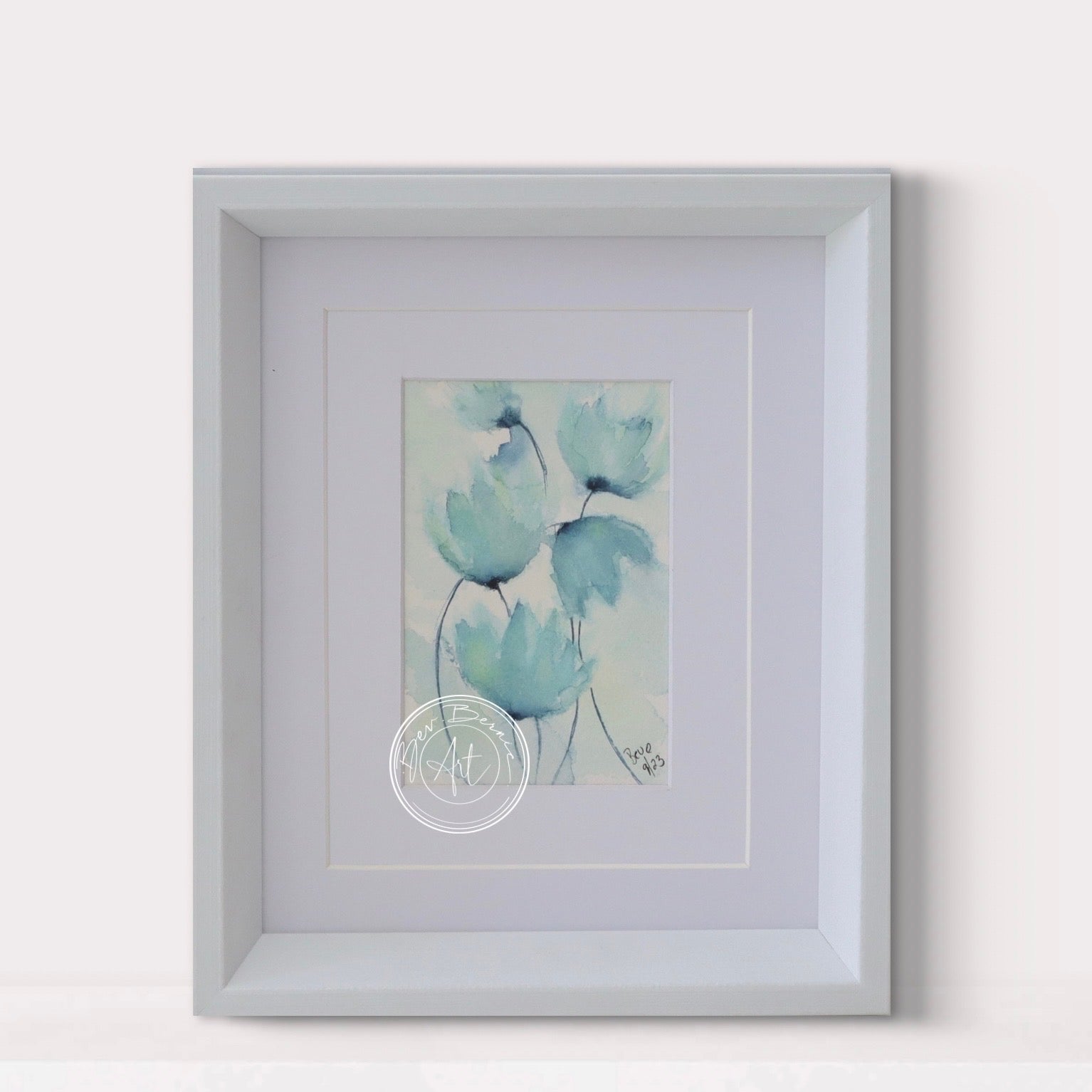 This beautiful watercolour painting features a delicate, abstract portrayal of soft blue flowers. The petals, painted with light washes of cool tones ranging from blue to soft green, create an ethereal, dream-like quality. The stems are thin, barely visible, giving the flowers a floating effect. The use of muted colours and light brush strokes adds a sense of calm and serenity, evoking a peaceful atmosphere.